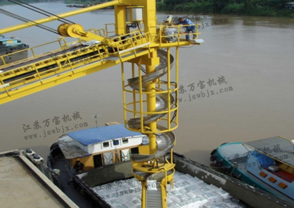 滑槽式裝船機的裝船能力一般在每小時100噸左右,最大也不超過每小時150噸。過大的速度會易造成袋物在帶式輸送機上堵塞,嚴重時會因袋物在過大傾角的螺旋滑槽上強烈下沖造成包裝袋破裂,所以在設計選型中不要盲目追求裝船能力以免帶來意想不到的不良后果。