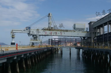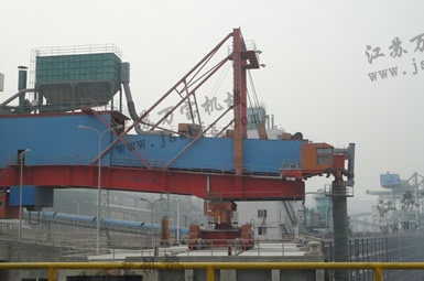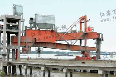 直線擺動式裝船機是我公司聯(lián)合長江航運科學研究所研制開發(fā)的一種高效新型散貨裝船機,是在國外流行的線性裝船機的基礎上做了重大改進創(chuàng)新設計的。該機最大的優(yōu)點是機構(gòu)新穎,結(jié)構(gòu)合理,性能先進,運行可靠,重量輕,耗能少,與順岸移動式裝船機相比,水工投資省,碼頭長度短40%,寬度窄35%;此外還省掉了供料尾車和順岸布置的皮帶機,而且受料點固定,揚塵少;與圓弧軌道和墩柱式裝船機相比,裝料覆蓋面大,勿需移船,不啃軌。代表了當今和未來大型散貨裝船機的發(fā)展方向。