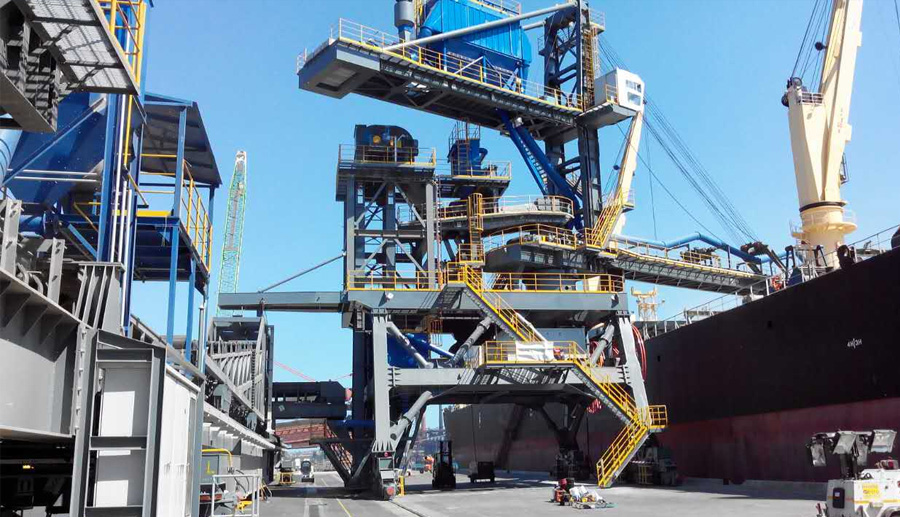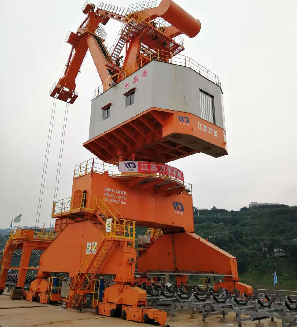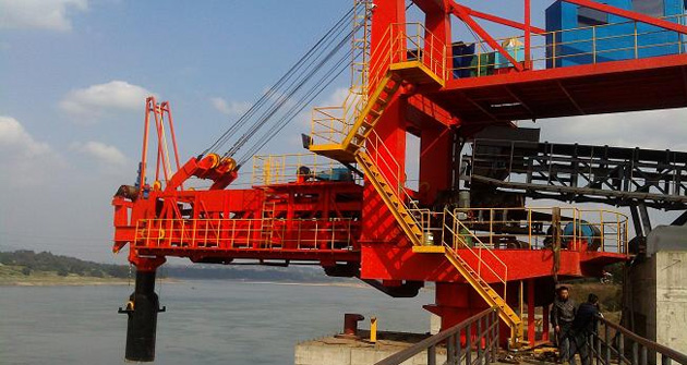 無軌道移動式裝船機(jī),行走裝置有輪胎、履帶兩個(gè)系列,物料進(jìn)入裝船機(jī)的方式有:1)自卸卡車直接倒料的進(jìn)料裝置,每套進(jìn)料裝置的接受能力為625m3/h,弧形懸臂式可配置兩套進(jìn)料裝置,裝船能力達(dá)到1200m3/h,塔式可配置四套進(jìn)料裝置,裝船能力達(dá)到2400m3/h;2)裝載機(jī)進(jìn)料的料倉;3)皮帶機(jī)進(jìn)料的料斗。有軌道移動式裝船機(jī),如圓弧軌道式、直線軌道式、前直線軌道擺動和后直線軌道擺動。對于水文落差較大的碼頭,采用在浮式躉船安裝1-2臺圓弧軌道式,直線軌道式需要配置相應(yīng)的尾車輸送機(jī),擺動式裝船機(jī)適用于環(huán)保要求較高的碼頭,采用大跨距的回轉(zhuǎn)橋架,完成長大艙口的覆蓋面積。對于船型很小或移船方便的碼頭,為減少投資,可選用墩座式裝船機(jī)。袋包裝船有螺旋滑槽式和托輥式。